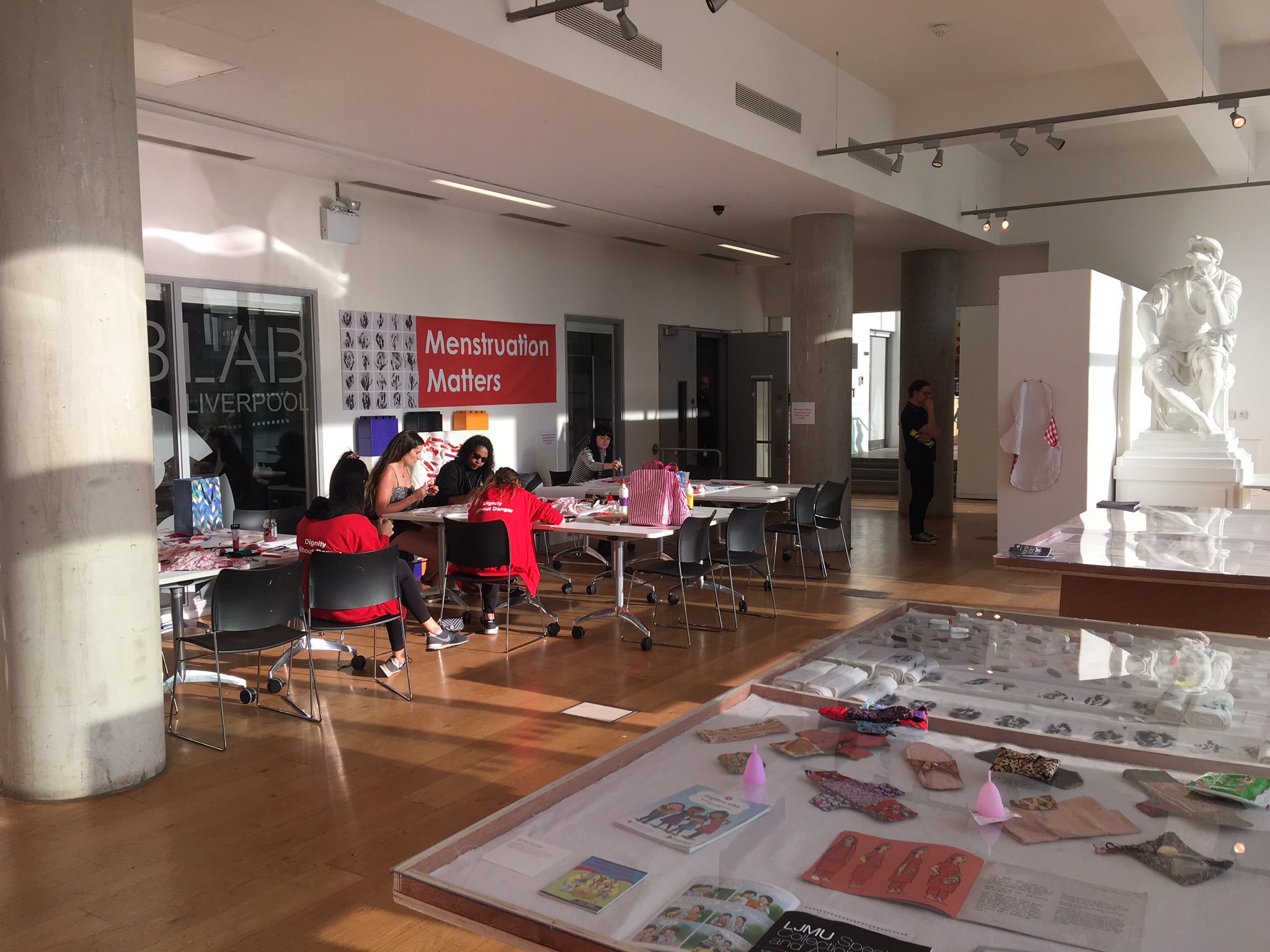 On Friday 17th May, menstrual research, art and activism were brought to Liverpool’s regular late-night arts festival, Light Night. Curated by Bee Hughes in collaboration with Dr Kay Standing and Dr Sara Parker, the Blood Rituals event shared a range of research and expertise from the UK and Nepal including Kay and Sara’s British Academy funded Dignity Without Danger project. The researchers were also joined the volunteers from Period Project Merseyside who led a craft event where visitors to the exhibition added their work to an ongoing collaborative artwork. The exhibition featured artworks from Bee Hughes, archival materials from the Femorabilia Collection at LJMU Special Collections and Archives, alongside Poloumi Basu’s VR artwork, A Ritual of Exile, which immerses the viewer in different women’s experiences of menstruation in Nepal.