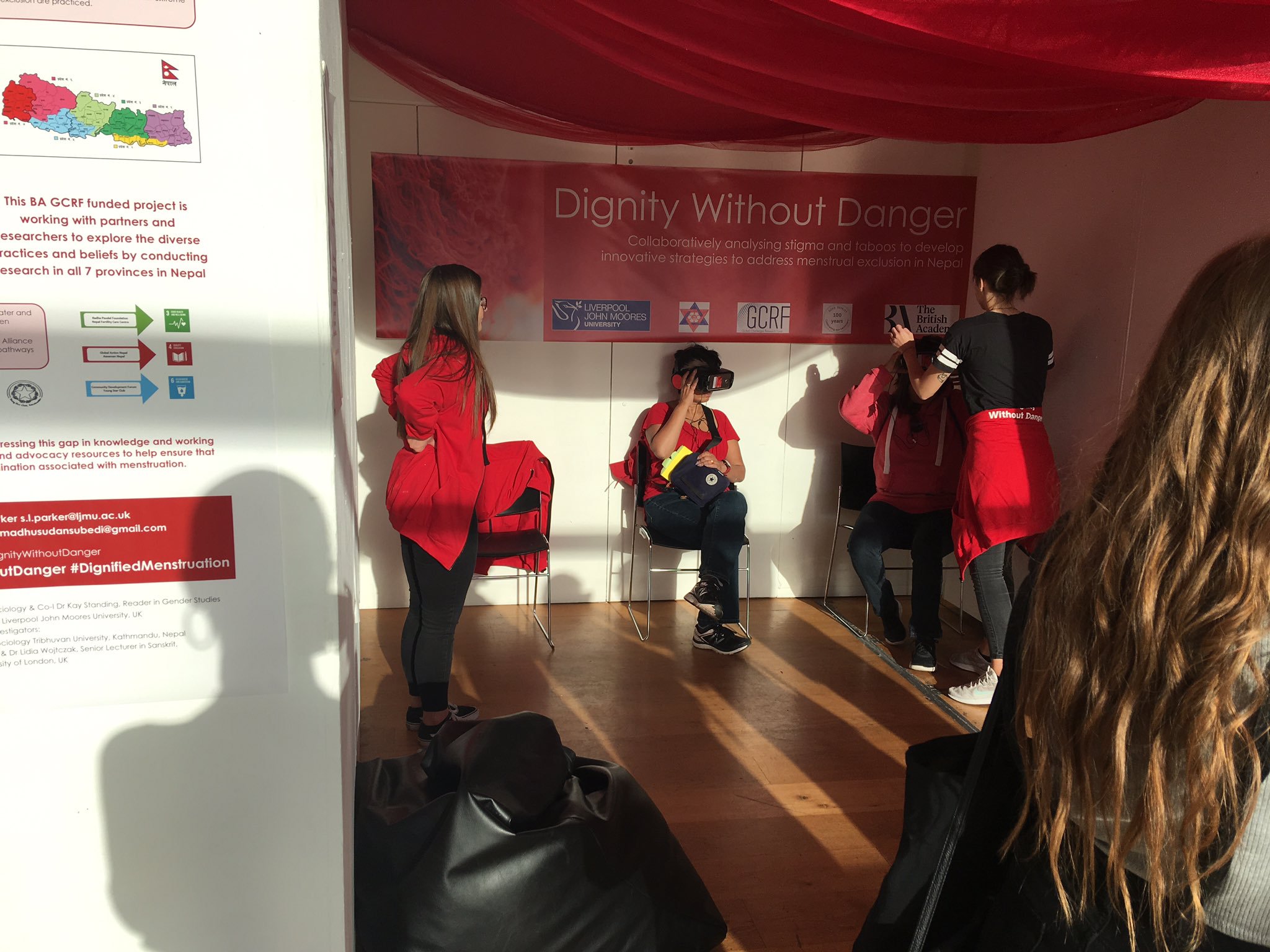 On Friday 17th May, menstrual research, art and activism were brought to Liverpool’s regular late-night arts festival, Light Night. Curated by Bee Hughes in collaboration with Dr Kay Standing and Dr Sara Parker, the Blood Rituals event shared a range of research and expertise from the UK and Nepal including Kay and Sara’s British Academy funded Dignity Without Danger project. The researchers were also joined the volunteers from Period Project Merseyside who led a craft event where visitors to the exhibition added their work to an ongoing collaborative artwork. The exhibition featured artworks from Bee Hughes, archival materials from the Femorabilia Collection at LJMU Special Collections and Archives, alongside Poloumi Basu’s VR artwork, A Ritual of Exile, which immerses the viewer in different women’s experiences of menstruation in Nepal.